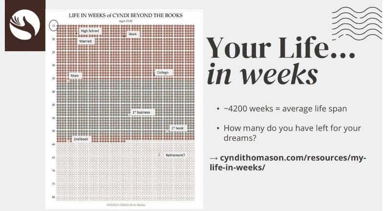 You’re probably thinking you’ve got the rest of your life to figure everything out, which is true. However, that may not be as much time as you think when you look at it in a new perspective. The Life in Weeks Chart from my book, Motherhood, Apple Pie, and All That Happy Horseshit, can open your eyes to how much time you really have. By breaking down your life in to the time spent in each stage, from going to school to working to raising a family, you begin to realize that there may not be much time left for things you want to achieve if you wait until the “time is right”.